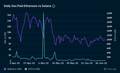 不出所料,Solana 的平均使用成本比以太坊便宜得多。 事实上,用户每天花费 5 到 9,000 美元的汽油,而在以太坊上花费 2 到 2,000 万美元。