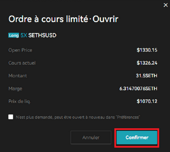 你必须使用按钮 (6) 确认打开你的订单。 这里相当于 31.5 ETH(杠杆 x5,保证金为 6.31 ETH)。