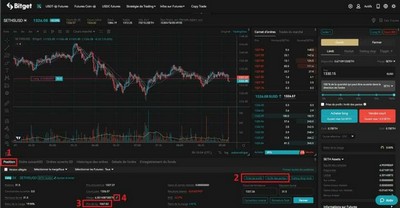 真实模式或演示模式,由你根据个人资料选择 首先在屏幕上显示 ETH/USD 对 (1)。 你可以通过选择右下角的货币对 (2) 查看你的 ETH 持有量。