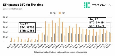 这一转变于 2022 年 9 月 15 日上午成功进行。这是一个姗姗来迟的历史性更新,因此市场能够期待很长时间。 因此,2022 年 8 月,ETH 期货的交易量首次超过了 BTC