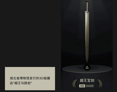 2021年10月29日12时,湖北省博物馆镇馆之宝“越王勾践剑”的数字藏品正式对外发行,用户上支付宝搜粉丝粒小程序购买、鉴赏和分享。该批数字藏品共10000份,上线即售罄。