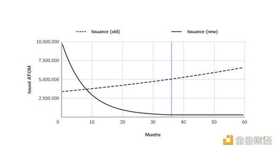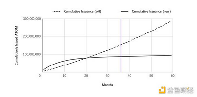 注:ATOM累计发行量曲线,虚线为ATOM 1.0,实线为ATOM2.0