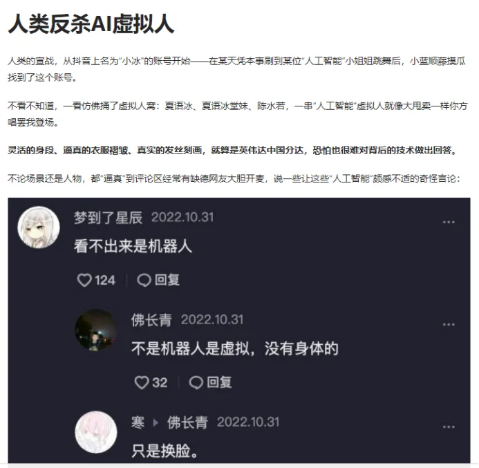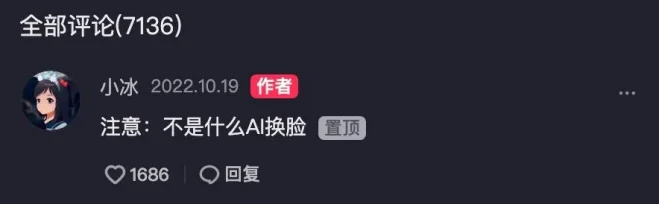 速途元宇宙研究院了解到,不久前,小冰曾被质疑“AI换脸”,“小冰”的抖音账号认证为音乐人,其中不少网友认为只是AI换脸,并不是人工智能,“小冰”曾在抖音评测区回复“注意:不是什么AI换脸”,但这并没有阻挡网友的深扒热情。