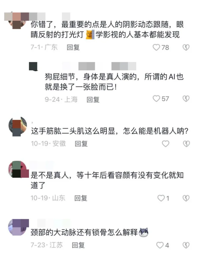 更有网友在小冰视频作品的评测区质疑:“最重要的点是人的阴影动态跟随,眼睛反射的打光灯,学影视的人基本都能发现”“这手筋肱二头肌这么明显,怎么能是机器人呐”“身体是真人演的,所谓的AI就是换了一张脸而已”