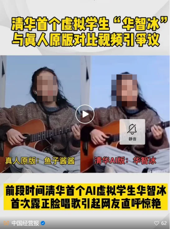 去年10月,小冰和清华大学联合培养的虚拟学生华智冰弹唱视频引发网友争议,被质疑真人AI换脸。对此,小冰团队表示,华智冰演唱视频中的肢体视频模板来自于小冰团队成员鱼子酱酱视频。