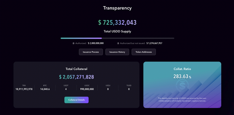 从理论上讲,USDD 似乎得到了比特币 (BTC)、Tron (TRX) 和 USDC 形式的 20 亿美元加密货币质押品矿池的充分支持,据报道,储备比稳定币供应量高出 283% 以上。