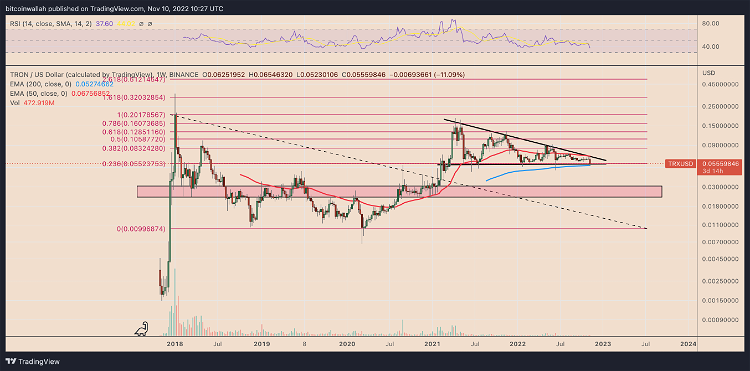 Tron 代币现在着眼于跌破其支撑长期支撑汇合点,包括其 200 周指数移动平均线(200 周 EMA;蓝色波浪)接近 0.052 美元和 0.236 斐波那契线接近 0.055 美元。