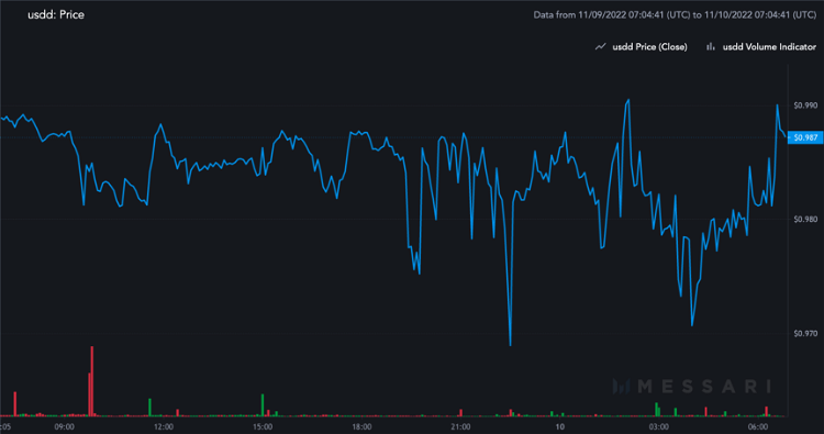 但在 11 月 8 日,当一些鲸鱼抛售超过 1100 万美元的代币以寻求在竞争对手稳定币 Tether (USDT) 和美元硬币 (USDC) 中的敞口时,将 USDD 的价格保持在 1 美元还不够。 一天后,USDD 的价格跌至 0.96 美元的低点,随后在 11 月 10 日小幅回升至 0.98 美元。