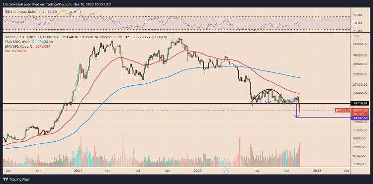 与此同时,比特币已进入其盛行的逆杯柄模式的崩盘阶段,现在将 14,000 美元作为其主要下行目标。