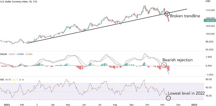 热门交易账户 Game of Trades 指出,DXY 日线图的相对强弱指数 (RSI) 创下了 2022 年的新低。