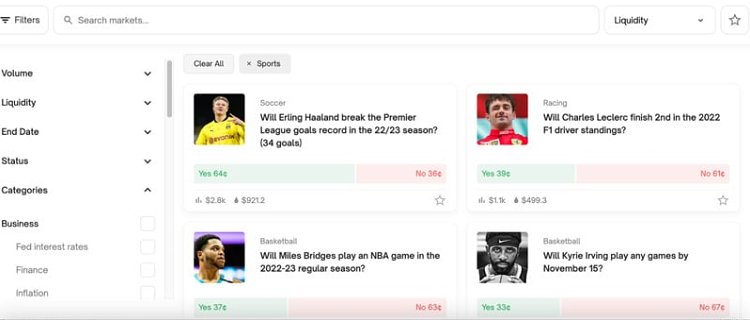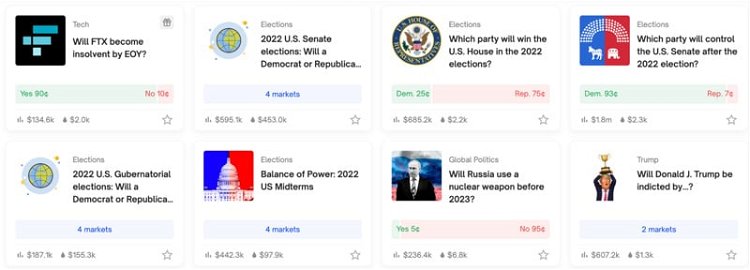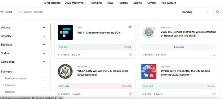Polymarket算是较为符合去中心化预测市场定义的产品,在Polymarket上可以对很多事件进行预测并获利。可以看到,由于Polymarket主要面向美国市场,预测事件也围绕着美国民众关心的热点时事,比如“哪个政党将在2022年的选举中赢得美国众议院”、“FTX 会不会破产”等。
