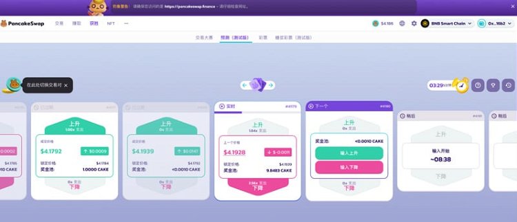 相对于传统意义上的预测市场,Pancake swap的做法更像是将类期权产品带到了链上,玩家可以通过质押自己的CAKE代币并猜测指定时间CAKE的币价是上涨还是下跌来赢取收益。