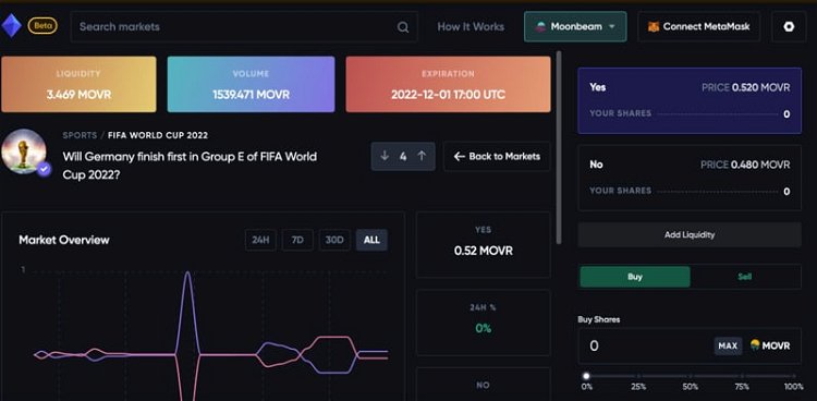 和Polymarket机制相同。不同点在于,Polkamarkets仍然采用的是其所在链(Moonriver)的代币MOVR而不是USDC,对于新用户可能在兑换和换算上会有一些障碍。