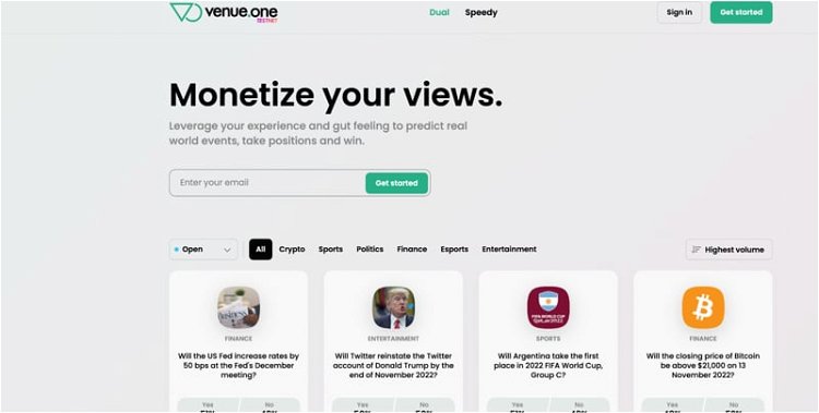 Venue One 是一个去中心化预测市场,拥有体育、电子竞技、金融、赛事等多个主题。