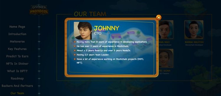 - CTO Johnny,有超过 8 年的应用开发经验。在区块链有超过 3 年的经验,超过 2 年的 Reactjs 和超过 3 年的 NodeJs 的经验。有 2 – 5 年的团队领导经验,及丰富的区块链项目(DeFi, NFT)工作经验。