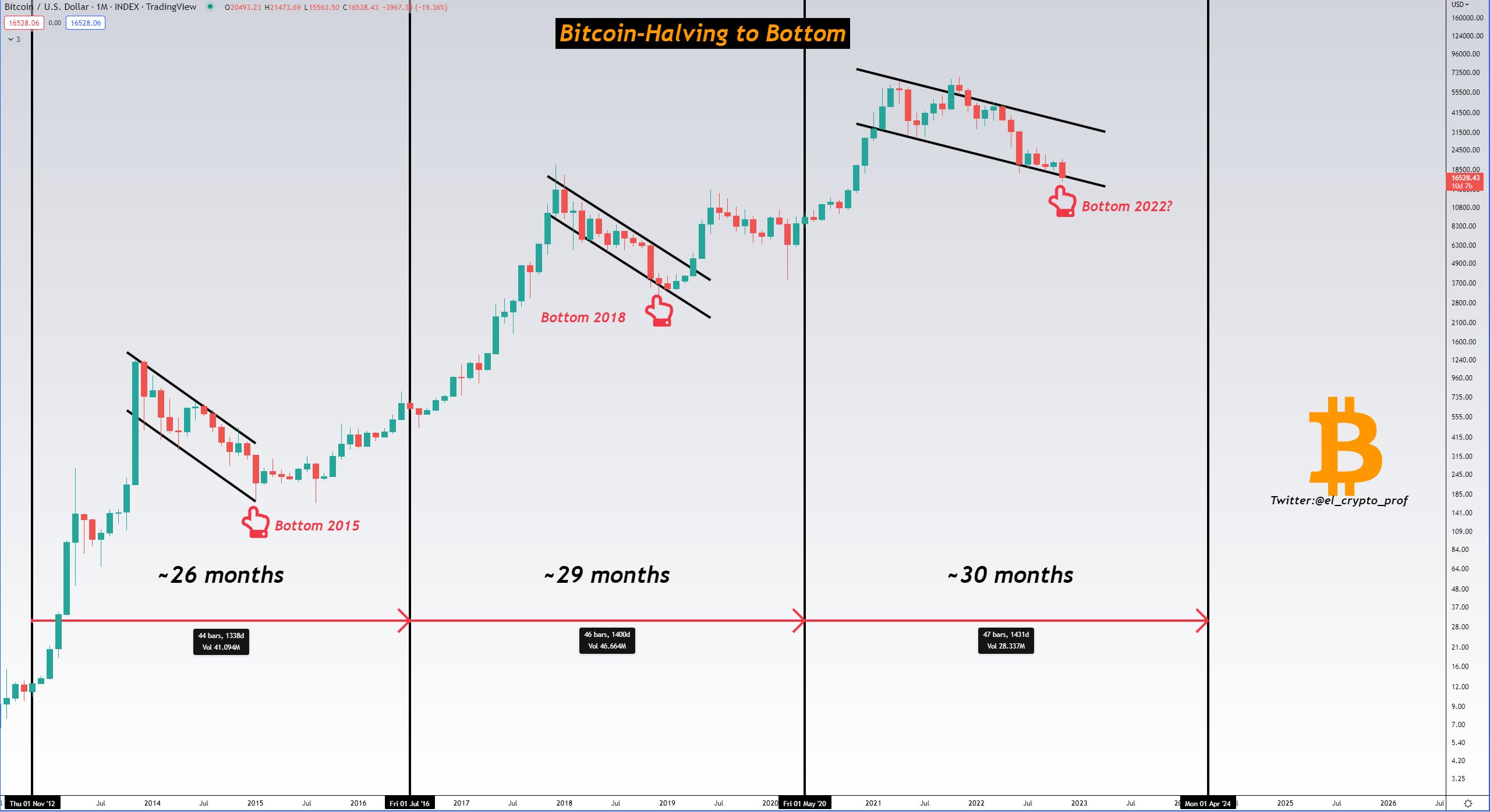 BTC/USD 现在距离其最新的历史高点过去了适当的几周,以形成一个新的宏观低点,流行的 Twitter 帐户 Mustache 显示。