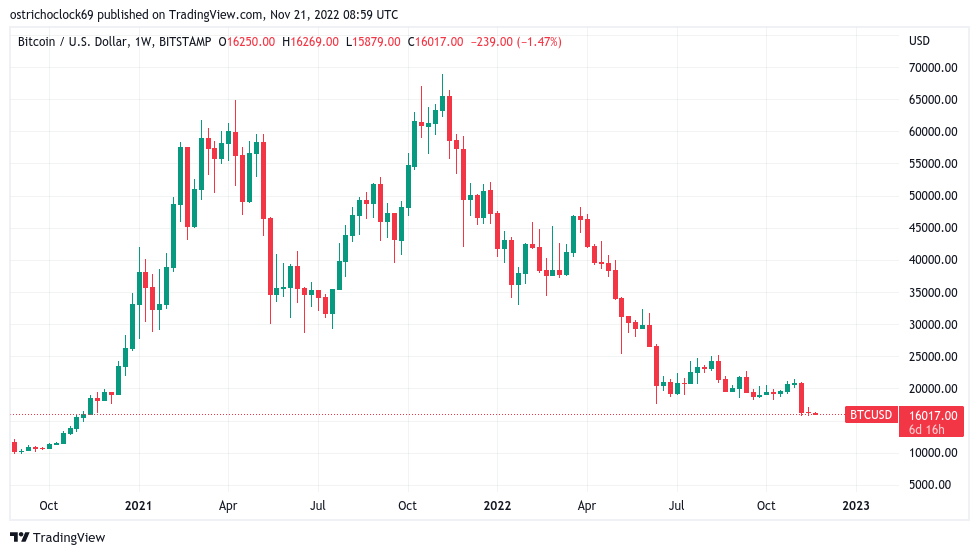 Cointelegraph Markets Pro 和 TradingView 的数据显示,最新的每周收盘价对这种情况没有帮助,比特币自 2020 年 11 月以来的最低价约为 16,250 美元,此后出现了新的损失。
