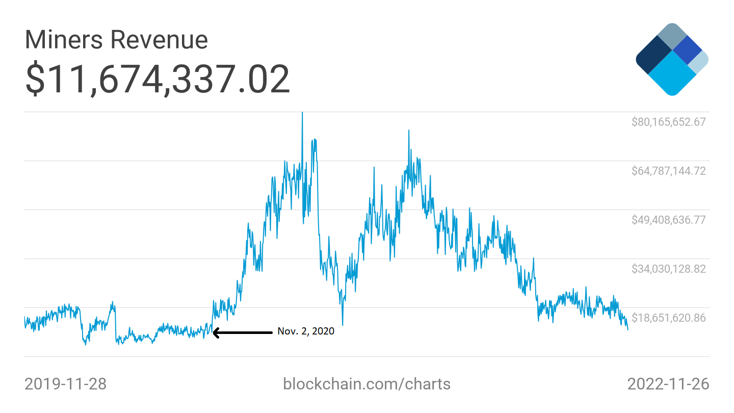 以美元计算的比特币挖矿总收入——区块奖励和交易费用——下跌至 1167 万美元,上一次出现该数字是在 2020 年 11 月 2 日,当时比特币的交易价格约为 13500 美元。