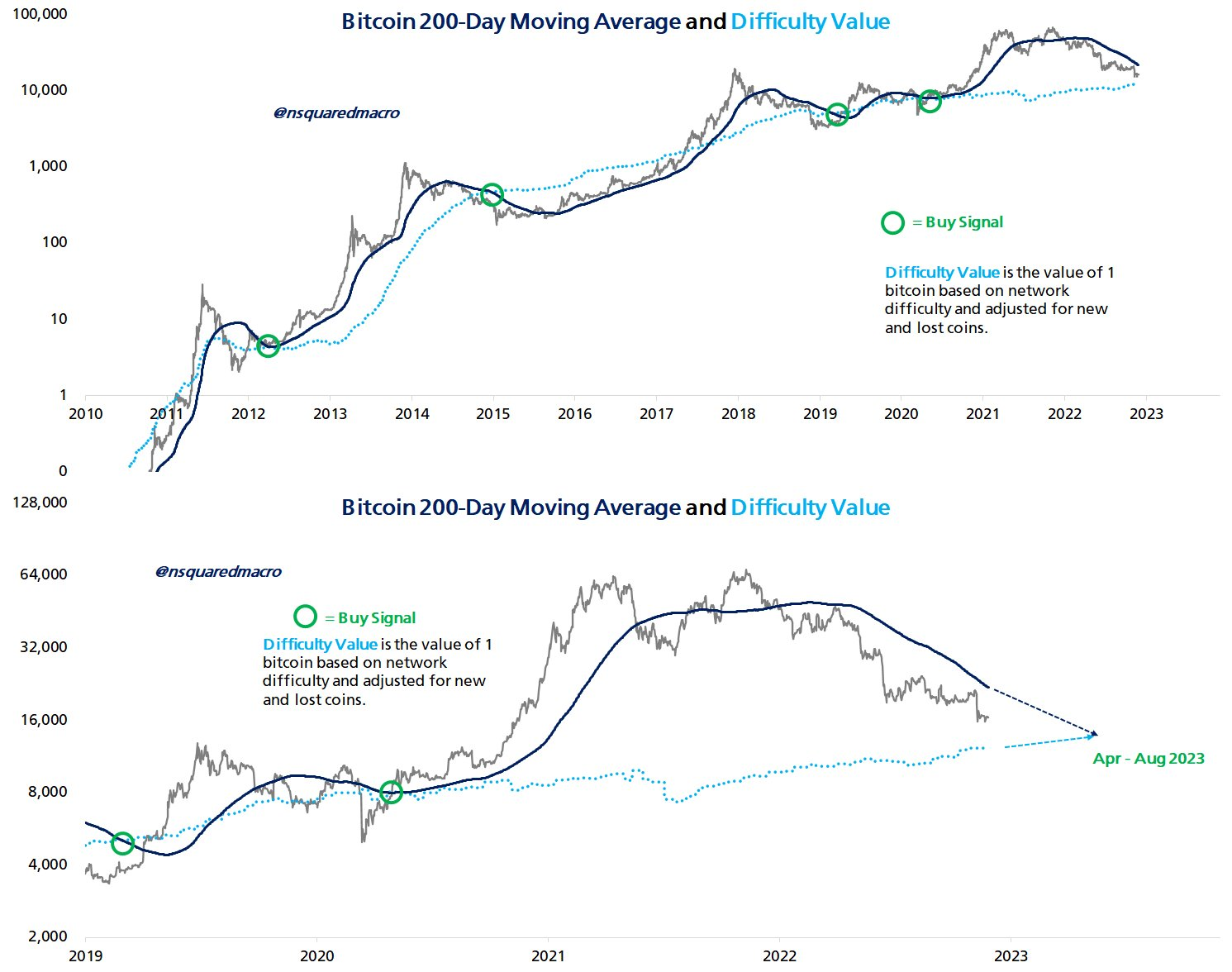 BTC/USD 200天移动平均线与难度价格K线走势图 来源:Timothy Peterson/推特
