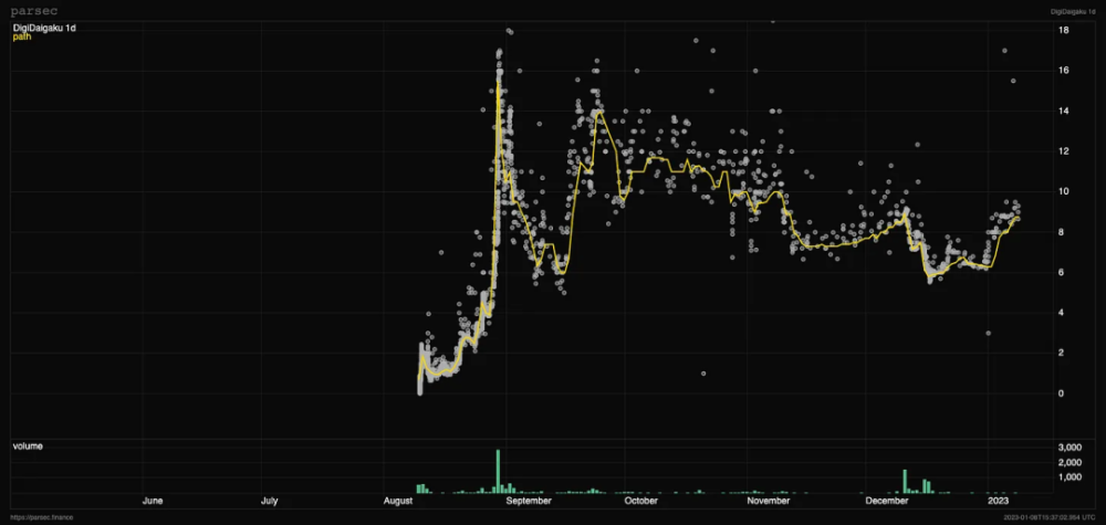 注意:当我写这篇文章时,DigiDaigaku 的地板价格是 7 ETH。在过去的几天里,它已经涨到了 12 ETH。