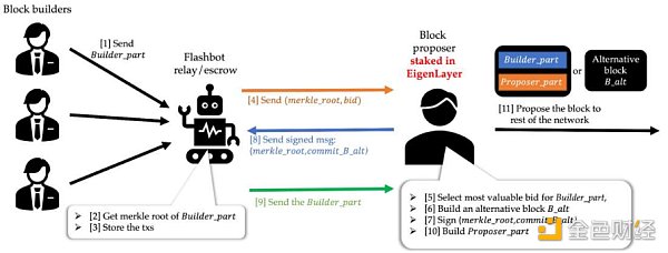 在MEV-Boost和使用中继的情况下,验证者不能将自己的交易插入到第三方构建者构建的区块中,因为在区块被提议上链之前,他们看不到区块内容。中继只向验证者显示区块头和奖励。只有在验证者签署区块头后,中继才会发送回区块的完整内容,以便验证者提议上链。这是为了确保验证者不能通过查看区块内容并重建区块来抢跑构建者。然而,如果通过EigenLayer对抢跑构建者的验证者施加额外的罚没规则,就可以更大程度保证构建者的区块部分在区块起始时就被正确包含,否则,再质押的验证者将面临严重的罚没惩罚。