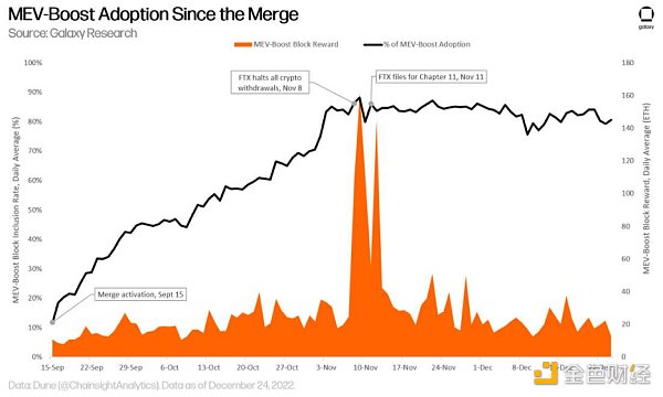 截至2022年12月,大约有80%的以太坊验证者通过MEV-Boost这一中立第三方软件获取MEV。MEV-Boost是由Flashbots与以太坊核心开发人员合作设计的,是一个允许验证者与多个链下市场连接以拍卖区块空间(也称为中继)的软件。通过中继,验证者接收包含优先费用及由第三方区块构建者构建的MEV区块。