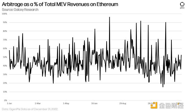 搜寻者通过在一个区块内对用户交易的执行进行排序来确定提取MEV的机会。搜寻者在积极监控公共内存池,并确定利润最大化方法,以从用户交易中提取价值,有时还会导致去中心化交易所(DEXs)交易下滑和更糟的执行。MEV策略通常模仿传统股票市场的做法,如frontrunning(抢先交易)、sandwiching(三明治交易)、stop hunting(猎杀止损)和arbitrage(套利)。在2022年提取最多价值的MEV策略是套利。根据EigenPhi的数据,套利约占2022年所有MEV收入的一半。下图显示了搜寻者每天赚取的套利收入占总MEV收入的百分比:
