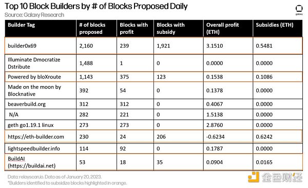 一旦构建者锁定了一个有利可图的区块,他们就会计算一个包含在区块中的出价,要么作为有利可图的优先费用,要么作为区块创建后从构建者直接转移到验证者的价格。出价越高,构建者越有可能看到其区块被包含在链上。构建者之间的最后一场竞争是通过区块补贴进行的。以太坊上至少有五个构建者提议的区块出价高于区块奖励价值,这表明这些构建者正在以某种方式补贴他们的区块。在每天提议区块数量最多的10个区块构建者中,有4个要为其区块提供补贴。