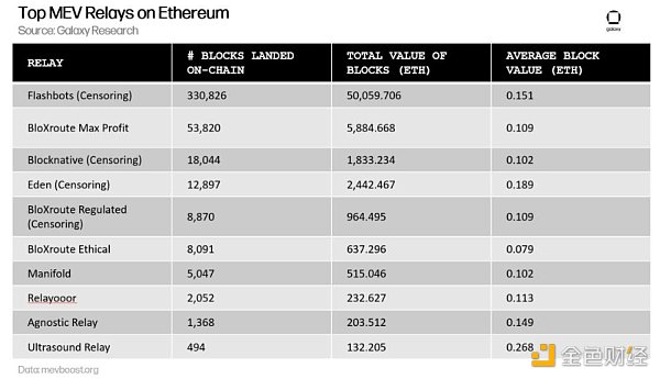 在CowSwap上有超过10个solver在竞争用户交易。然而,CowSwap只是以太坊上若干DEX中的一个,监控用户交易并捆绑交易是件有利可图的事。在Uniswap和Curve等其他DEX上,用户直接在链上执行自己的交易,一般搜寻者会竞标在中继上重新排序执行的权利,这部分内容将在后文进行详细讨论。以太坊上最赚钱和技能最娴熟的搜寻者是那些监测和分析链上活动——特别是去中心化金融(DeFi)交易——的专家。搜寻者需要对金融市场和交易有强大的了解,因为这些技能对于识别和利用创造MEV的市场低效至关重要。以下是2022年以太坊十大最具竞争力的MEV搜寻者: