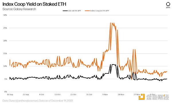 第一大质押实体是流动性质押服务提供商Lido。流动性质押衍生品(LSD)是代表质押ETH的资产,可以在以太坊上自由交易。用户经常将他们的LSD再抵押到去中心化金融(DeFi)应用程序中,如Aave,以赚取额外收益。Index Coop协议为用户提供了一种名为icETH的衍生资产,该资产自动从再抵押为Aave的ETH质押中赚取收益,然后用于获得更多的ETH质押。有时,Index Coop的收益几乎是普通ETH质押的两倍。