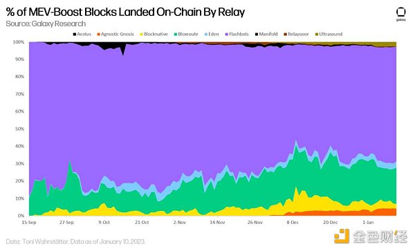 MEV-Boost软件功能的核心是验证者能够连接到多个中继,从而减少对某个MEV基础设施提供商的过度依赖。从验证者的角度来看,中继的可选性是一个特别重要的特性,鉴于在以太坊合并之前,矿工通过操作MEV-Geth软件来获得MEV所使用的唯一中继是Flashbots中继。Flashbots中继审查交易,以遵循美国的制裁。截至2022年12月,以太坊上有10个中继,其中6个没有进行用户交易审查。在6个非审查中继中(包括Agnostic、Ultrasound、Relayoor、Bloxroute Ethical、Bloxroute Max Profit以及Manifold),其中5个是未经许可的,这意味着任何构建者都可以向中继提交区块。唯一经许可并要求构建者在提交区块之前被列入白名单的非审查中继是Bloxroute Ethical。Bloxroute Ethical有意拒绝来自被检测为私人订单流交易源的构建者的区块,目的是为用户提供更“道德”的中继替代方案。Flashbots中继是一种审查和未经许可的中继,是最受欢迎的中继,赢得了最多的区块。然而,其主导地位正逐渐减弱,如下图所示: