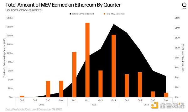 2022年1月1日至2022年12月31日期间,以太坊产出的最大可提取价值(MEV)为1.33亿美元。(下图数据包含Flashbots根据以太坊上MEV的新识别方法更新的数据,可能与Galaxy Research去年的MEV报告中数据有所不同)。