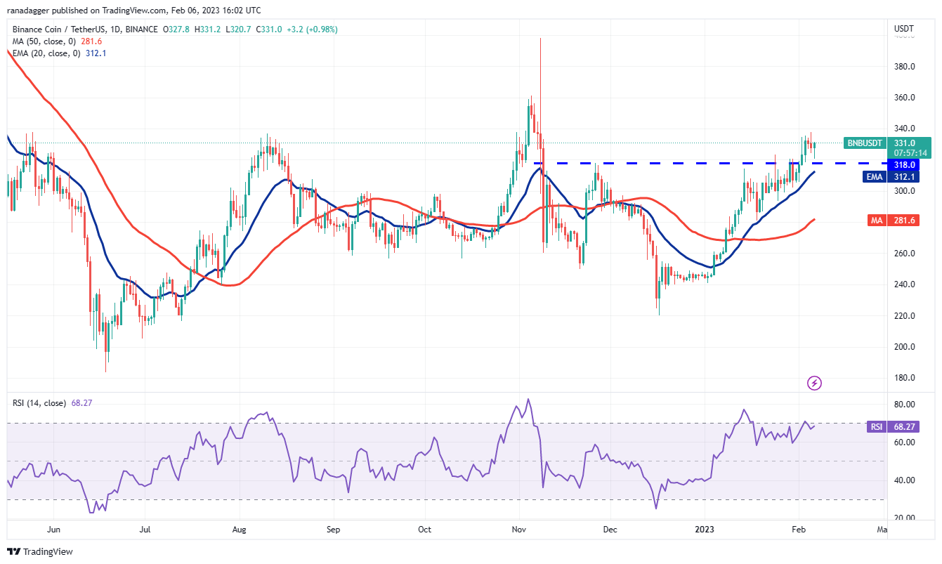 2 月 5 日,买家将 BNB (BNB) 的价格推高至 335.50 美元的阻力位上方。但烛台上的长灯芯表明空头正在以更高的水平抛售。 价格回落至 318 美元的突破水平,从 2 月 6 日烛台的长尾可以看出多头正在积极买入。
