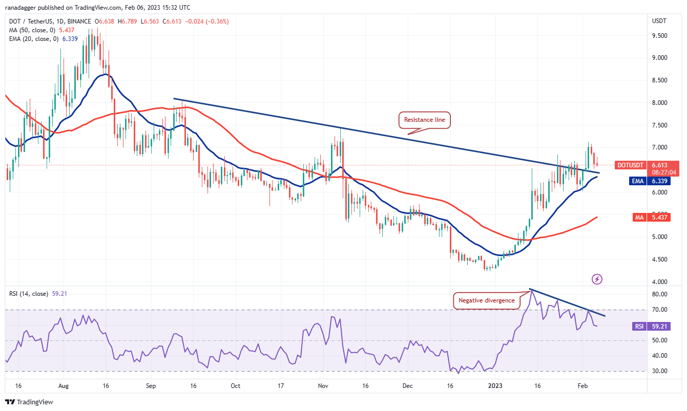 买家正试图保护阻力线的突破水平,但面临逢高抛售。 RSI 显示负背离,但一个小的积极因素是多头成功地将 Polkadot(DOT)保持在 20 天均线(6.33 美元)上方。