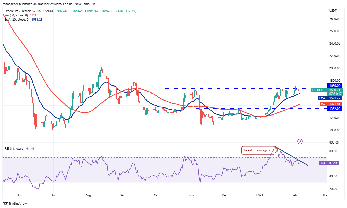 以太币 (ETH) 仍夹在 20 日均线(1,591 美元)和上方阻力位 1,680 美元之间。 这种窄幅交易不太可能持续很长时间,突破可能很快就会发生。