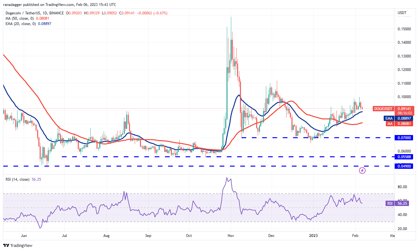 2 月 4 日,多头再次试图突破 0.10 美元的上方障碍,但空头坚守阵地。 这将狗狗币 (DOGE) 拉回 2 月 5 日的 20 天均线(0.09 美元)。