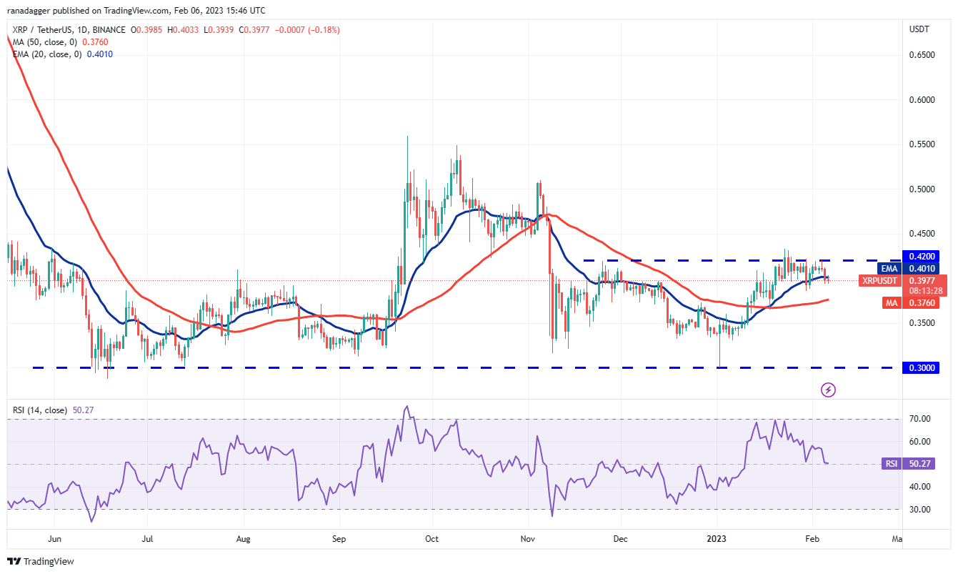 多头未能在 2 月 4 日将瑞波币 (XRP) 的价格推高至 0.42 美元以上,这表明空头正在严密守卫这一水平。 2 月 5 日,胆大包天的空头将价格拉低至 20 日均线(0.40 美元)以下。