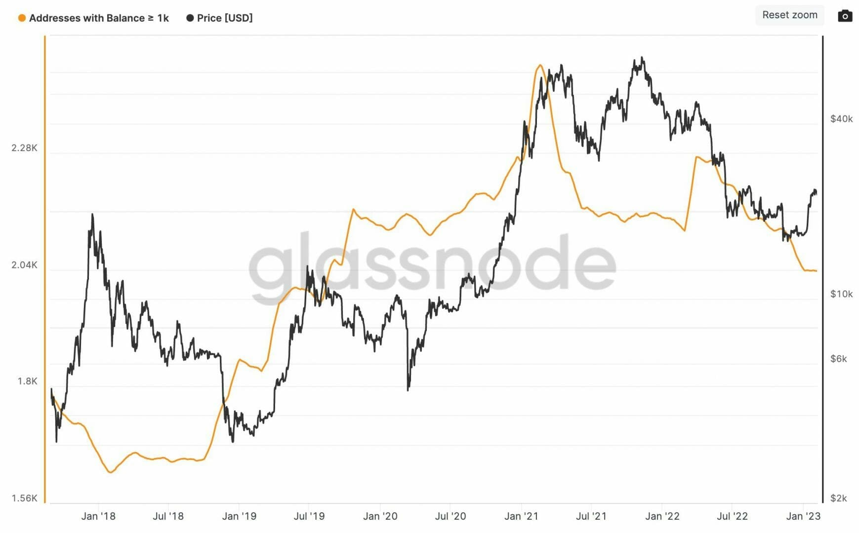 链上分析提供了有关超过 1,000 BTC 的钱包的信息,也称为鲸鱼。 这些实体目前仍处于观望状态: