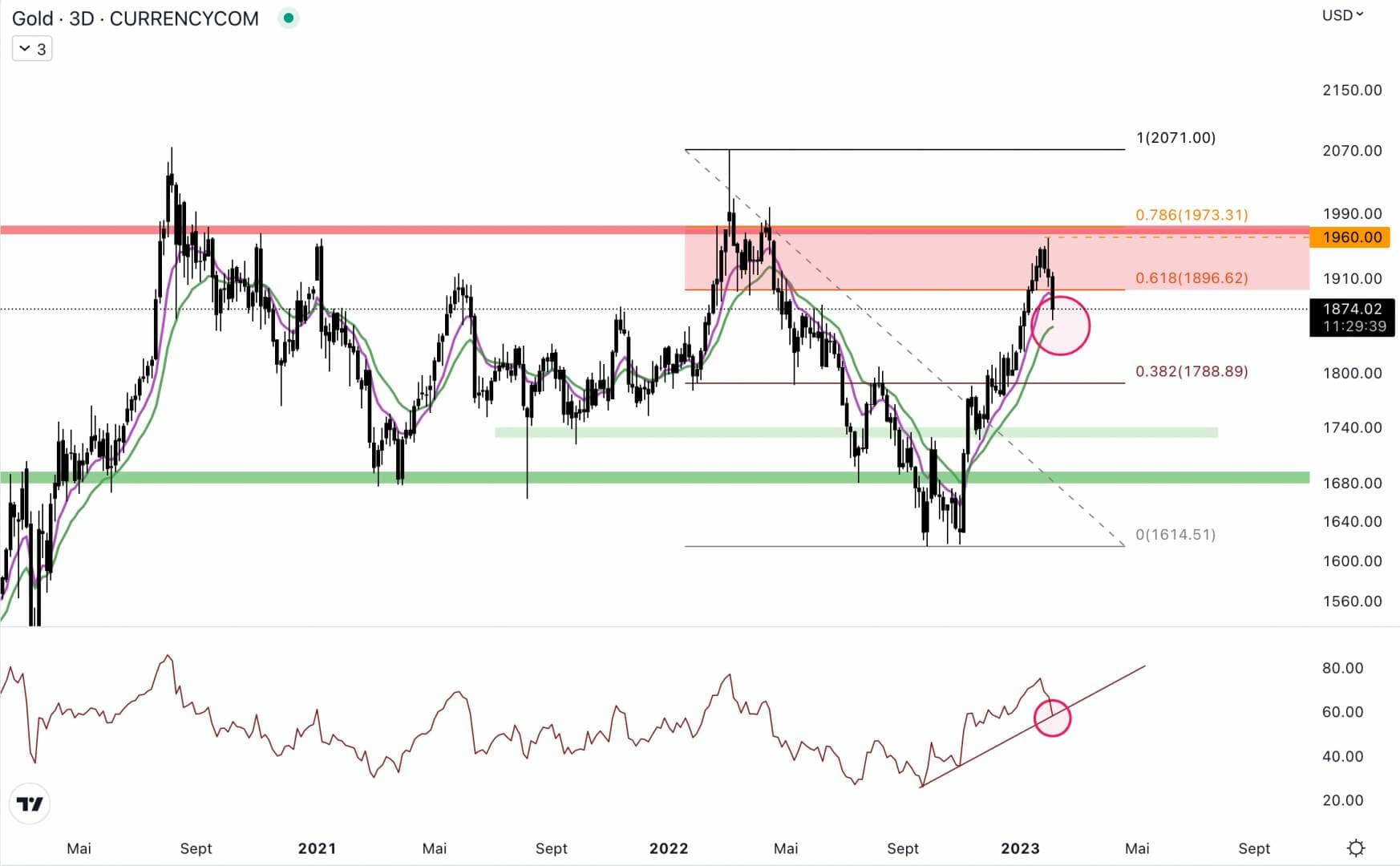 黄金价格兑美元 (3D) 黄金价格被拒绝在有利于获利了结的区域。 在一次不错的反弹之后,上涨结束了吗?