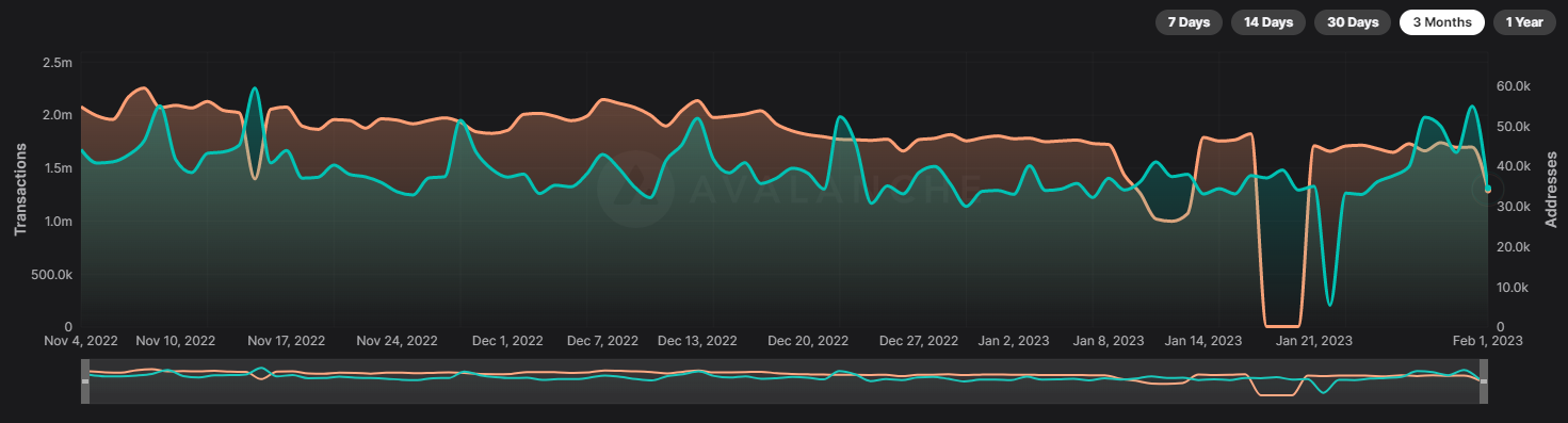 区块链健康的标志是活跃地址、用户和交易的数量。 尽管在 1 月 18 日达到了 184 万笔交易的年初至今高点,但 Avalanche 的交易数量呈下跌趋势。