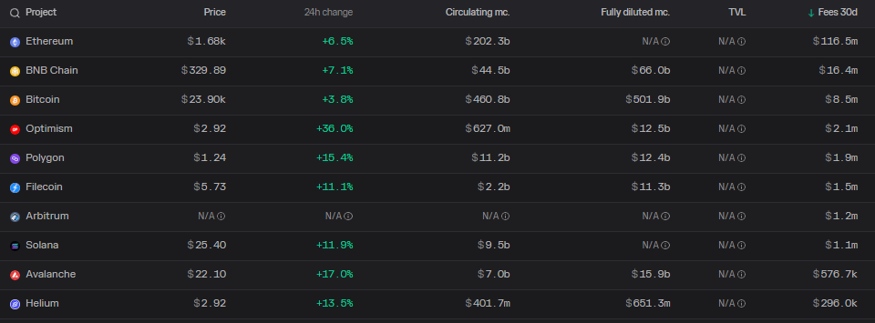 Avalanche 网络费用和 AVAX 价格。 来源:令牌终端 虽然 Avalanche 费用基础在增加,但它仍然落后于 Ethereum、币安链 (BNB)、Optimism (OP) 和 Polygon (MATIC) 等顶级 EVM 兼容区块链。 在过去 30 天里,Avalanche 产生的费用在所有区块链中排名第 9。