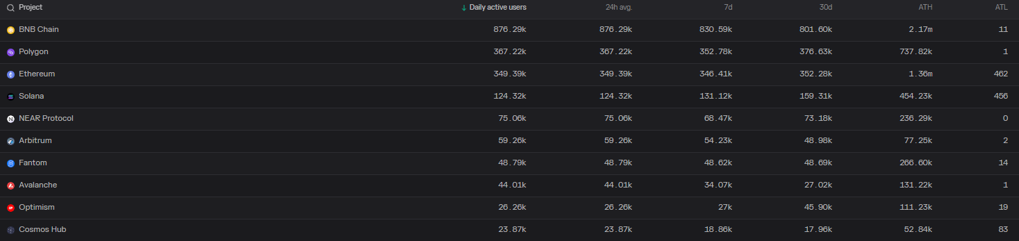 活跃地址和交易。 资料来源:Avalanche Avalanche 活动的下跌趋势正在进一步分离其他区块链。 根据代币Terminal 的数据,Avalanche 的历史最高 (新高) 日活跃用户数为 131,000,与 Polygon 的 新高 737,000 相比相形见绌。 Avalanche 目前的每日用户数远未达到历史最高水平,仅为 44,000 人。