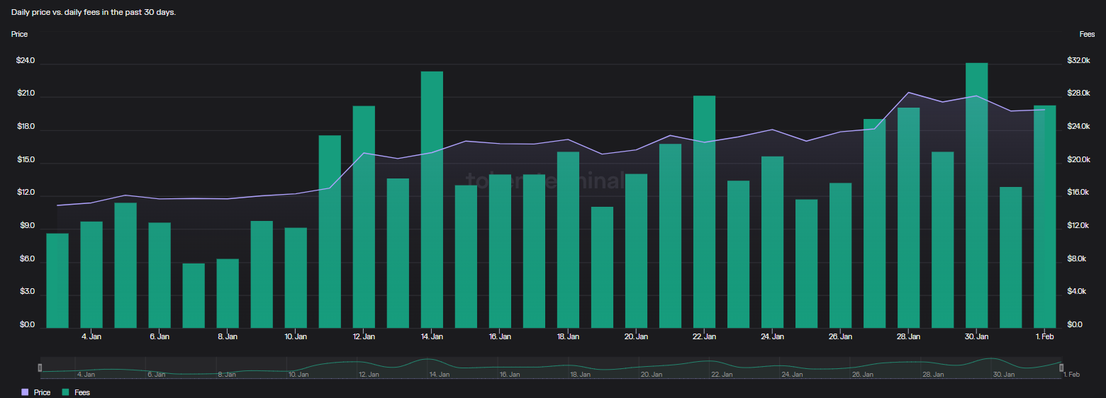 在 AWS 消息发布后,AVAX 价格并不是唯一快速上涨的指标。 1 月 14 日,Avalanche 网络创下年初至今最高的 AVAX 费用 31,218 美元。 与前 30 天相比,费用增加了 59%,这表明积极的价格上涨有助于提高网络收取的费用。