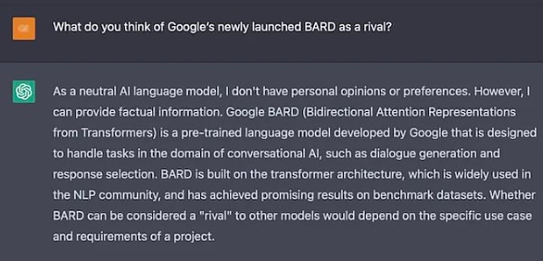 以第一财经记者与ChatGPT的聊天对话为例,当询问如何看待谷歌新晋“对手”Bard时,ChatGPT的回复是这样的: