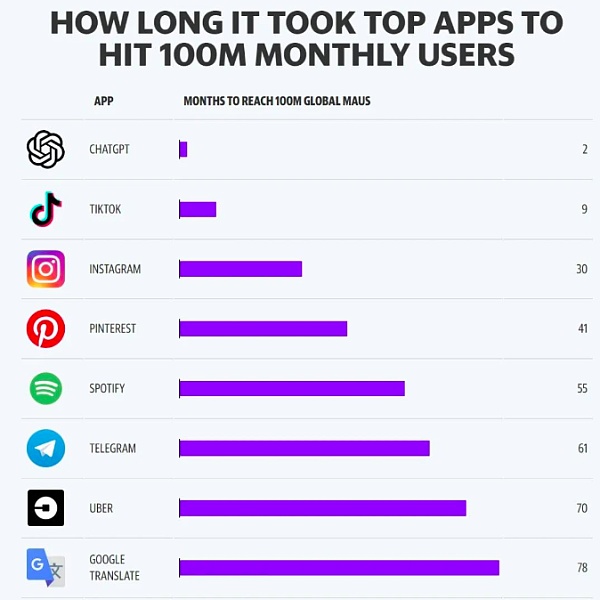 而ChatGPT在2022年11月推出后,仅花了60天,就达到了月活过亿,成为史上用户增长最快的互联网应用程序。