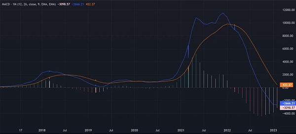 转向BTC的动量和趋势方向,使用一个月的MACD(26,9)。它显示了信号线(橙色)、MACD线(蓝色)和MACD直方图(红色)。该图表的直方图显示卖出势头稳步下降。从方向上看,看跌趋势仍然有效,MACD线远低于信号线。然而,这种看跌趋势开始消失,一个月平均方向指数 (ADX) (14,14) 读数为 25.03,处于趋势指示阈值 25。如果 ADX 跌破 25,则看跌趋势无法延续确认的。