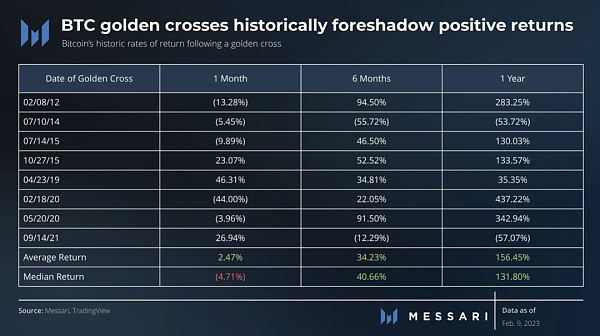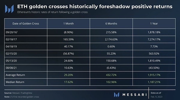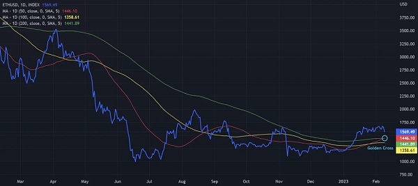 现在让我们看看以太坊,该资产在1月3日突破了50-SMA,在1月8日突破了100-SMA,在1月11日突破了200-SMA。50-SMA在1月25日突破了100-SMA,在2月9日突破了 200- SMA。50-SMA与200-SMA的交叉在日线图上实现了黄金交叉。在过去 6.5 年左右的时间里,黄金交叉预示着非常积极的回报。