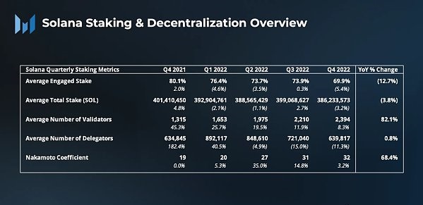 尽管发生了不利 Solana 的事件,网络的质押和去中心化仍然保持相对稳定。Solana 的平均质押参与率在去年保持在 75% 左右。