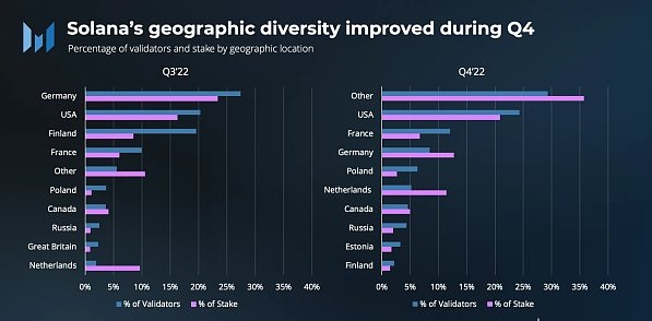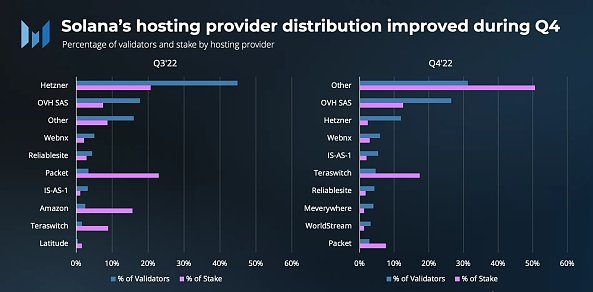 2022 年 11 月初,Hetzner 取消了对 Solana 相关活动的支持,并表示其政策禁止将其服务器用于加密货币相关活动。好在此举还不足以让网络中断。尽管如此,该事件还是证明了网络过于集中在单一地理位置和数据中心的潜在风险。