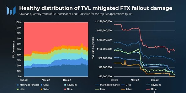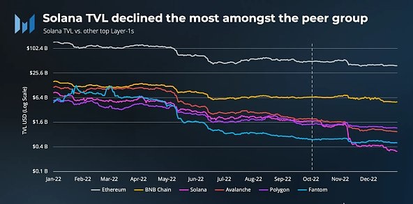 Solana DeFi 受 10 月 Mango Markets 漏洞和 11 月 FTX 崩溃的。由于 Alameda 不再进行链上操作,总价值锁定(TVL)大幅下降。